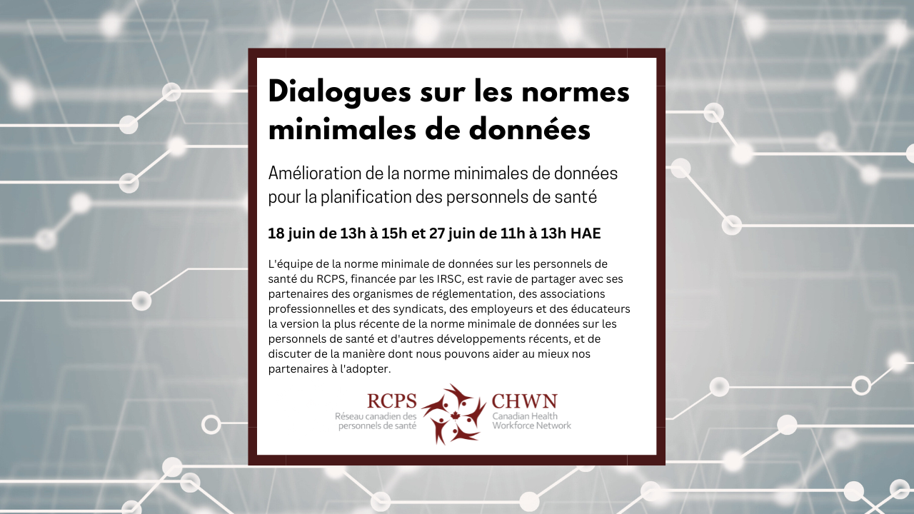 L'équipe de la norme minimale de données (NMD) sur les personnels de santé, financée par les IRSC, est ravie de partager avec ses partenaires des organismes de réglementation, des associations professionnelles et des syndicats, des employeurs et des éducateurs la version la plus récente de la NMD et d'autres développements récents, et de discuter de la manière dont nous pouvons aider au mieux nos partenaires à l'adopter.