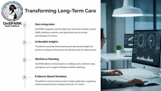 Au-delà du soutien aux foyers individuels, OnSPARK aide les chercheurs et les décideurs politiques à suivre les tendances à l'échelle du secteur. Il permet d'évaluer si les nouvelles réglementations, les nouveaux modèles de financement ou même les programmes d'immigration pour les travailleurs de la santé atteignent leurs objectifs. En établissant un lien entre les modèles de dotation en personnel, les résultats pour les résidents et les coûts du système, il soutient également les décisions politiques fondées sur des données probantes, une étape essentielle pour rendre les soins de longue durée plus durables.