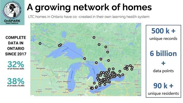 OnSPARK est un réseau volontaire composé de partenariats entre des organismes de soins de longue durée, l'Université McMaster et PointClickCare, le principal fournisseur de dossiers de santé électroniques pour les soins de longue durée en Ontario. Avec plus de 200 établissements participants, OnSPARK héberge des données relatives aux résidents et au personnel des établissements de soins de longue durée. Il s'agit du plus grand réseau de partage de données au Canada, représentant 32 % des établissements de soins de longue durée de l'Ontario et 38 % de leurs résidents. La plateforme de données comprend :